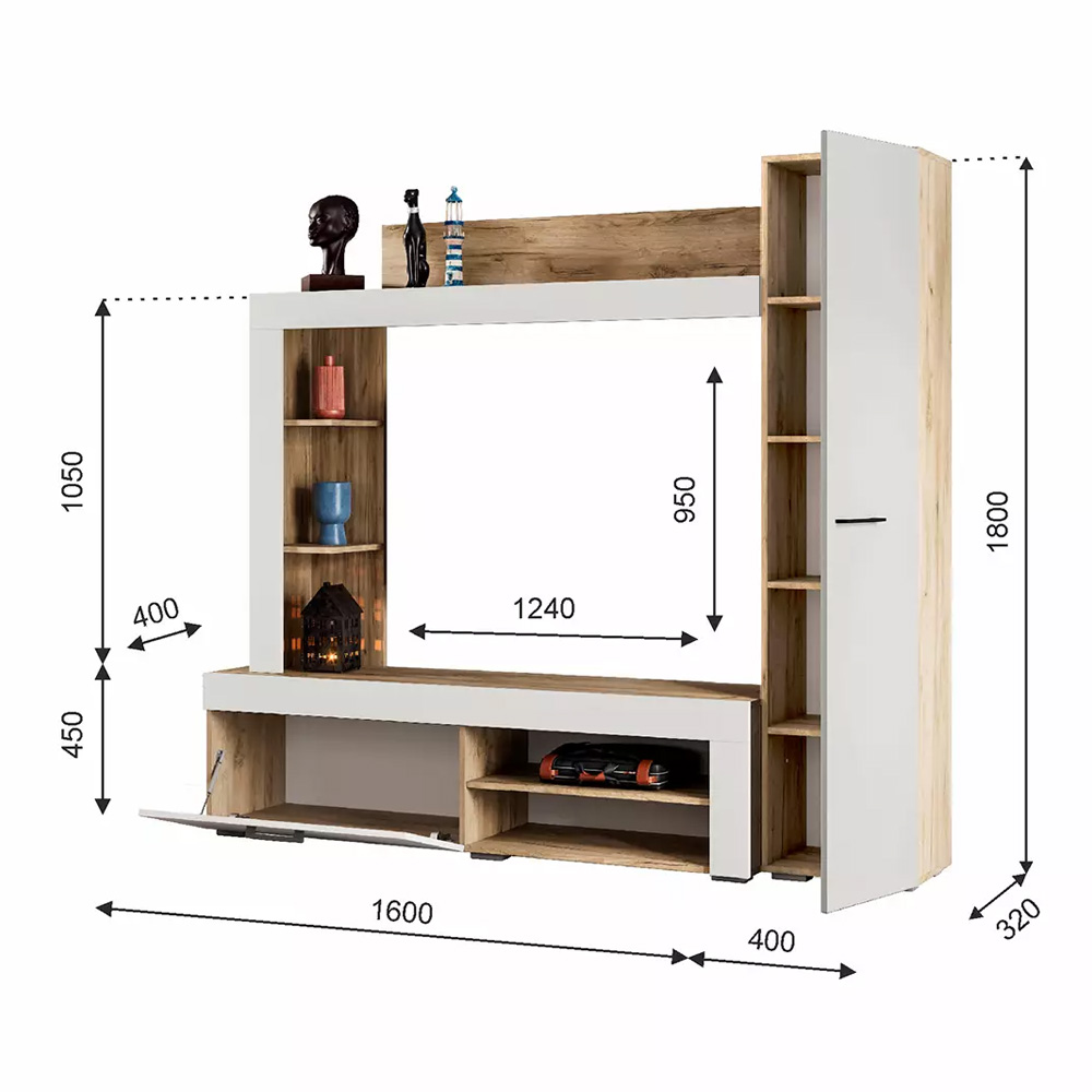 Она состоит из различных модулей, таких как полки, шкафы и место для телевизора.