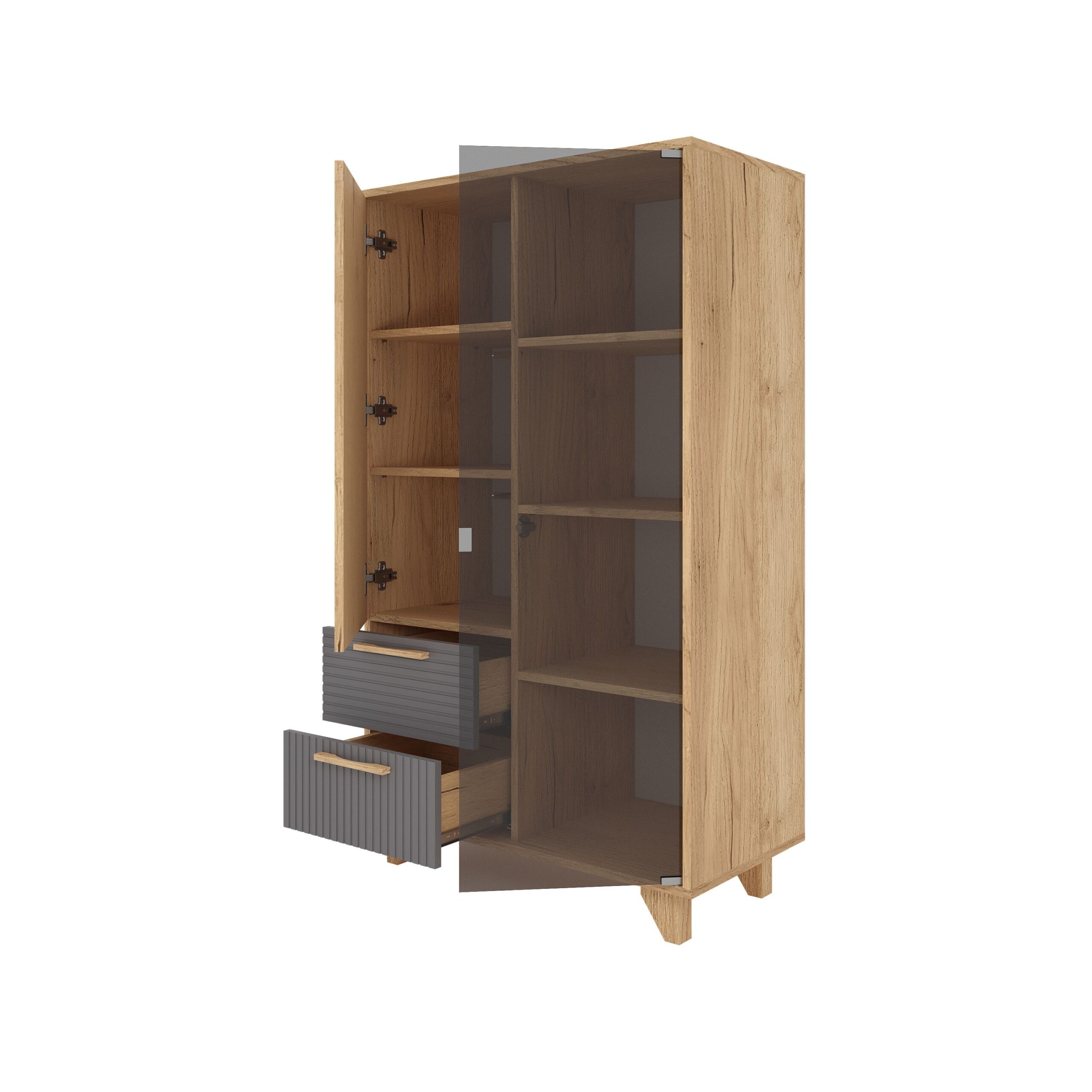 МС Ньёрд Шкаф-Витрина Дуб вотан — функциональный модуль для хранения и демонстрации посуды, книг или декоративных элементов. Остеклённые фасады подчёркивают содержимое и добавляют интерьеру аккуратности. Модель подходит для гостиной или столовой зоны. Сочетает практичность хранения и декоративную функцию.