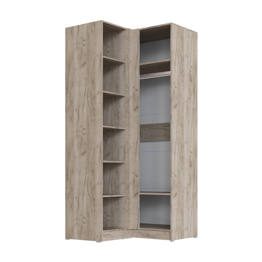 Рационально использовать пространство в комнате, при этом организовать хранение гардероба поможет угловой шкаф Вегас. Внутренне наполнение со штангой и многочисленными полками позволит разместить одежду и обувь.