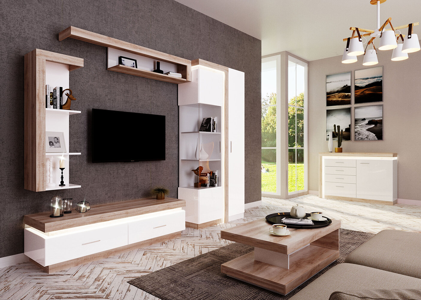 - Корпус ЛДСП 16 мм в декоре «Дуб Сакраменто» и фасад МДФ 16 мм в декоре «Белый снег»