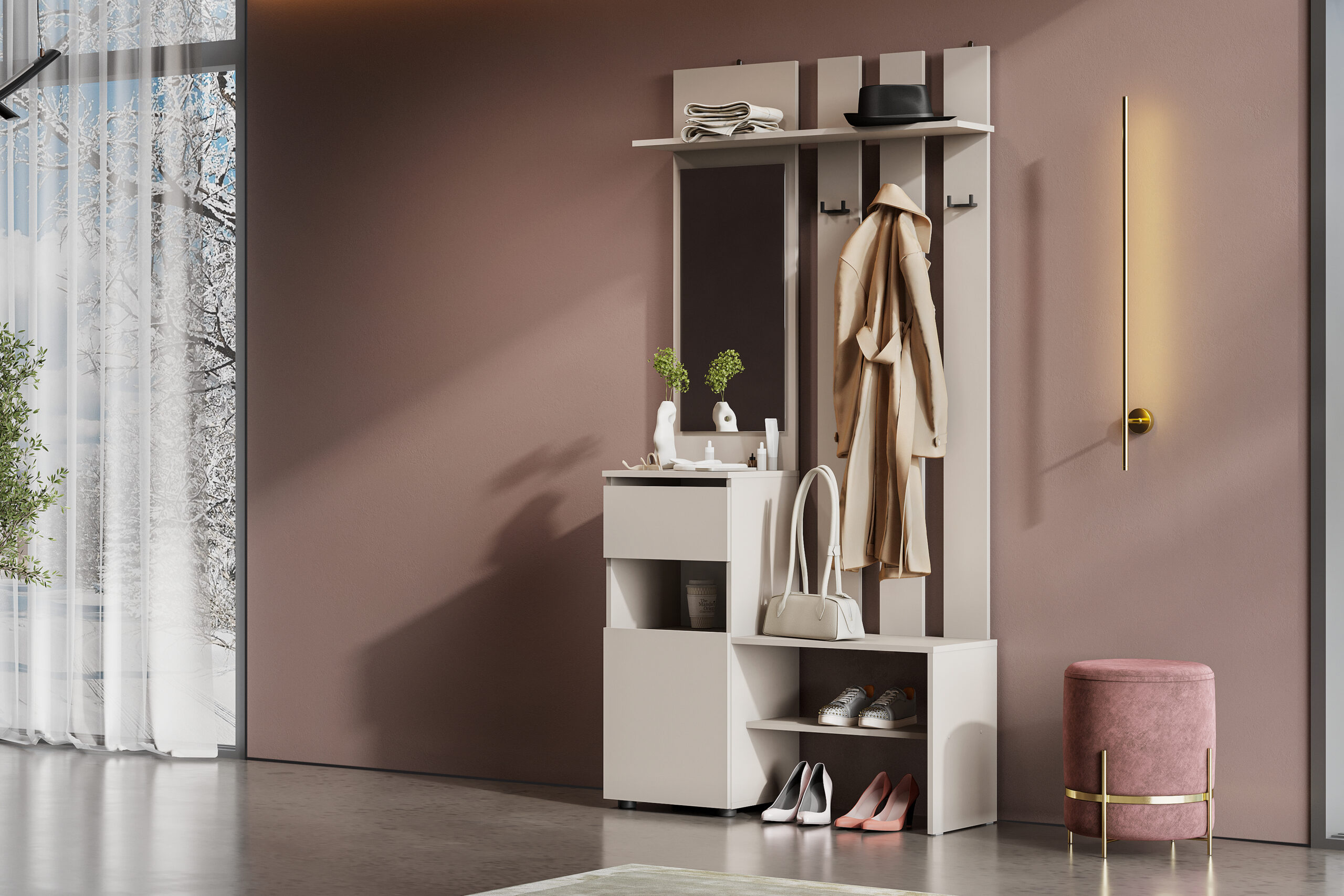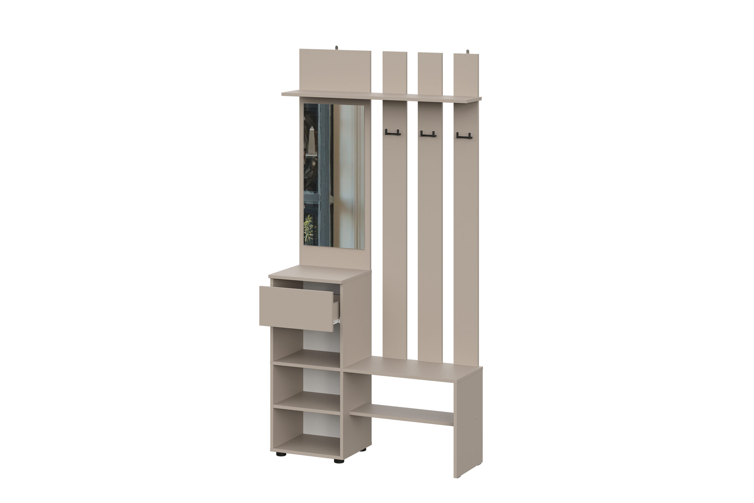 Вешалка Денвер в цвете меланж поможет организовать систему хранения гардероба в современном интерьере. Для вашего удобства предусмотрены двухрожковые крючки для повседневной верхней одежды, широкая верхняя полка для головных уборов и шарфов, ниша для обуви, а также выдвижной ящик. За распашным фасадом находятся небольшие полки. Зеркало позволит оценить внешний вид перед выходом из дома.