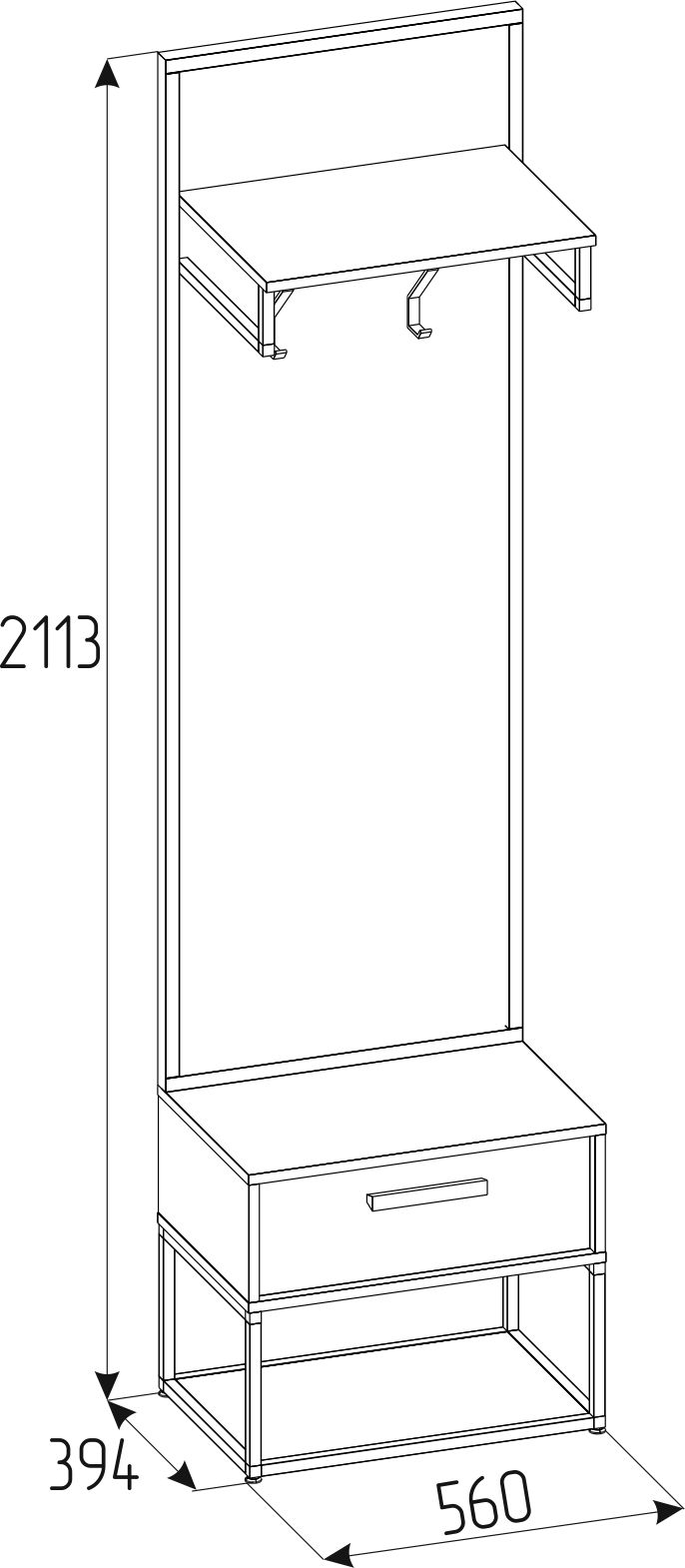 Открытая напольная вешалка поможет рационально обустроить даже небольшую прихожую, не загромождая пространство. Модуль состоит из вешалки, верхней полки, выдвижного ящика и открытой ниши. Полка для головных уборов крепится на профиль цвета Черный муар. Основание вешалки — профиль цвета Черный муар. Ящик оснащен шариковыми направляющими.