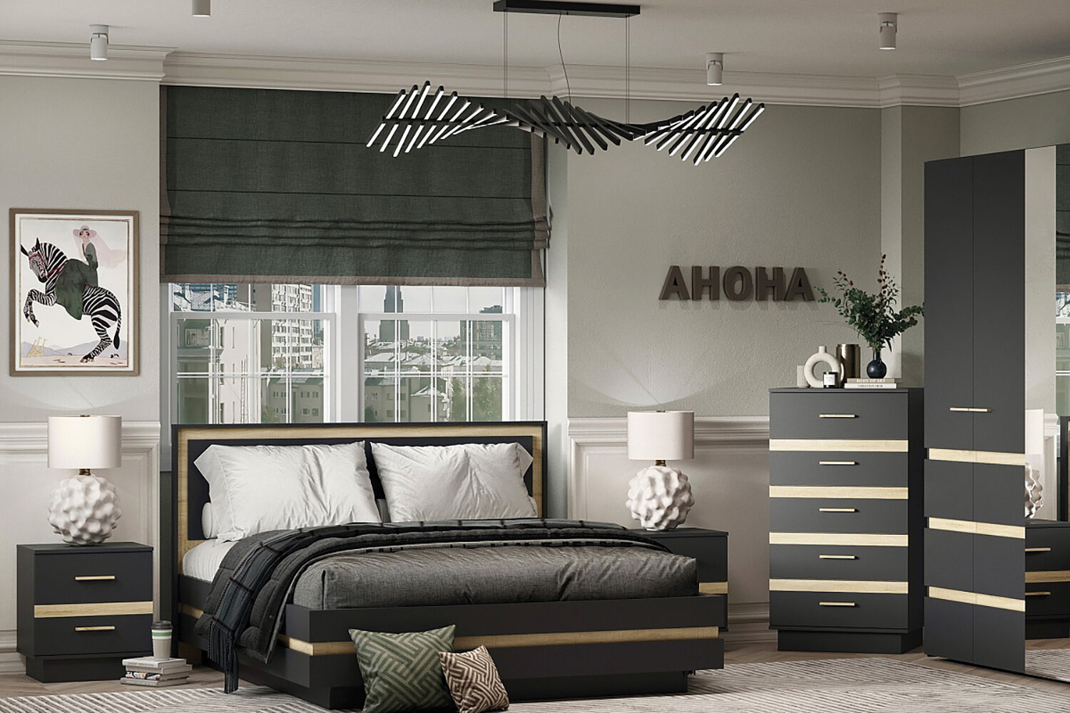 Спальня Анона станет вашим уютным уголком, где вы сможете отдохнуть после долгого дня и насладиться спокойным сном. Серия Анона выполнена в двух цветах: белый и антрацит с акцентными вставками в декоре дуб сонома.